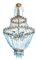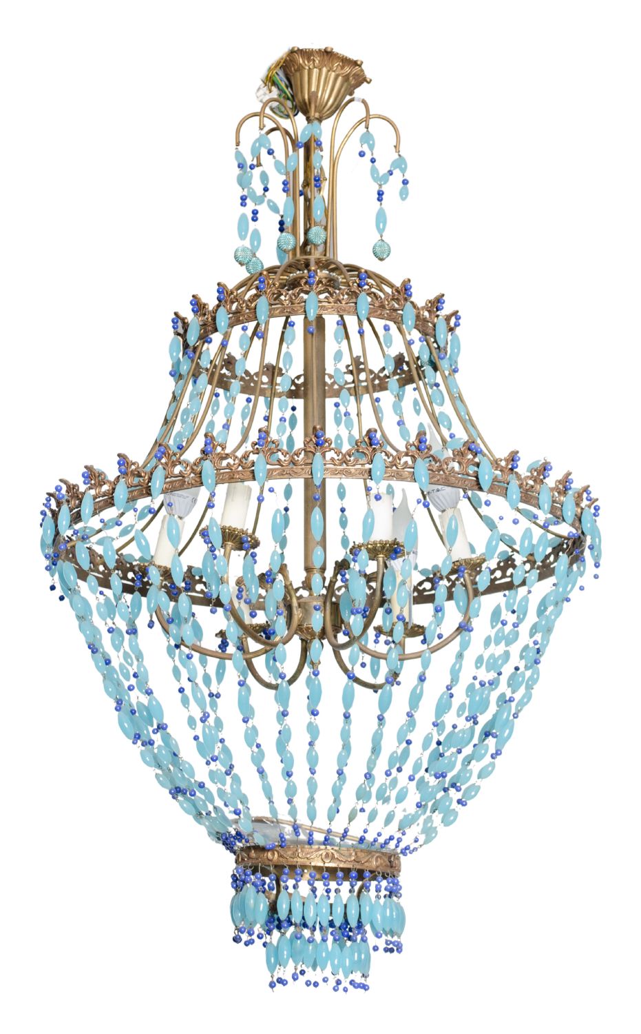 LAMPADARIO a mongolfiera a sei fiamme in ferro con guarniture e gocce in opaline turchese. XX secolo Misure: h cm 105