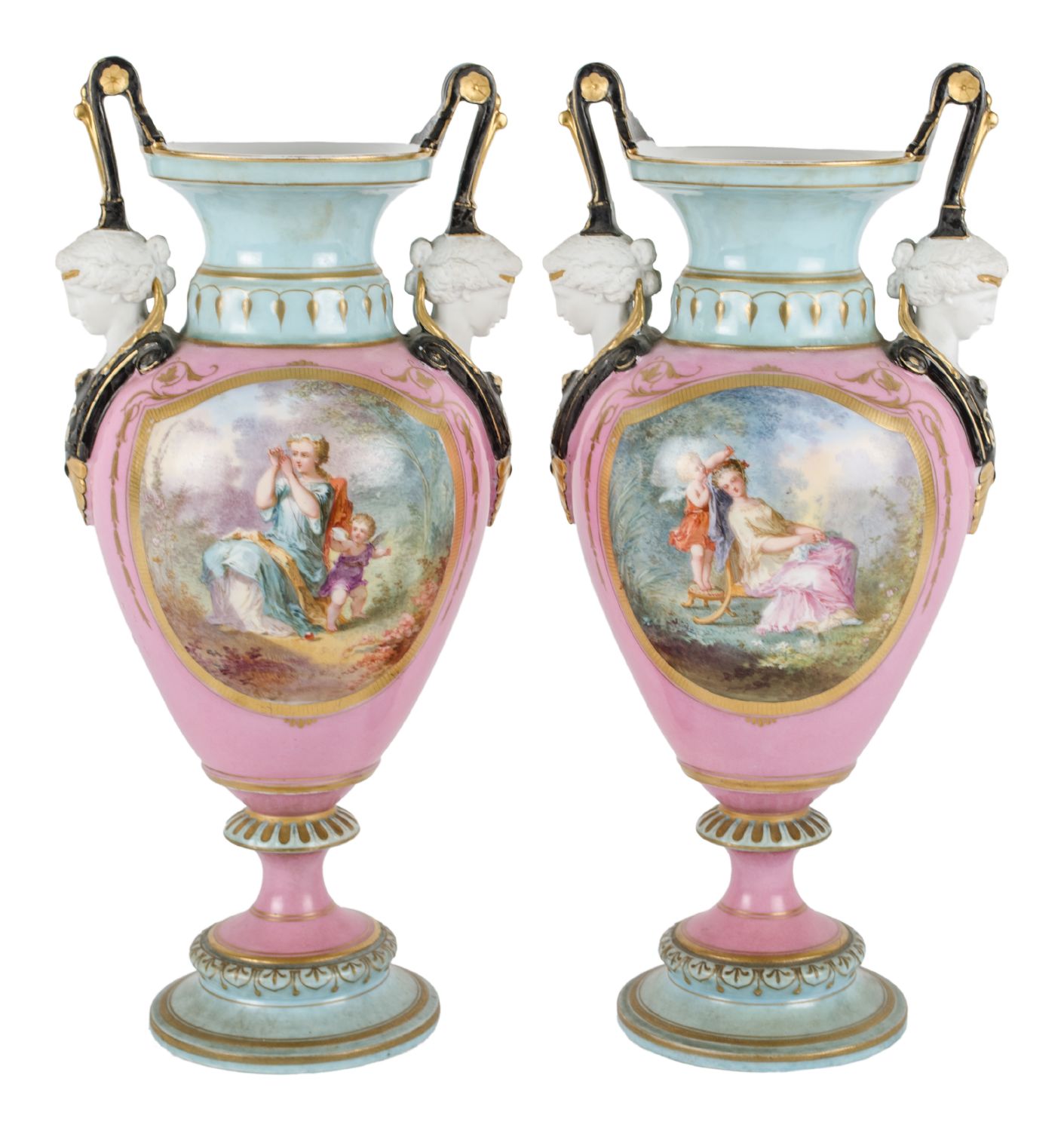 COPPIA VASI stile Impero in porcellana decorata a mano (rotture). Francia XIX...