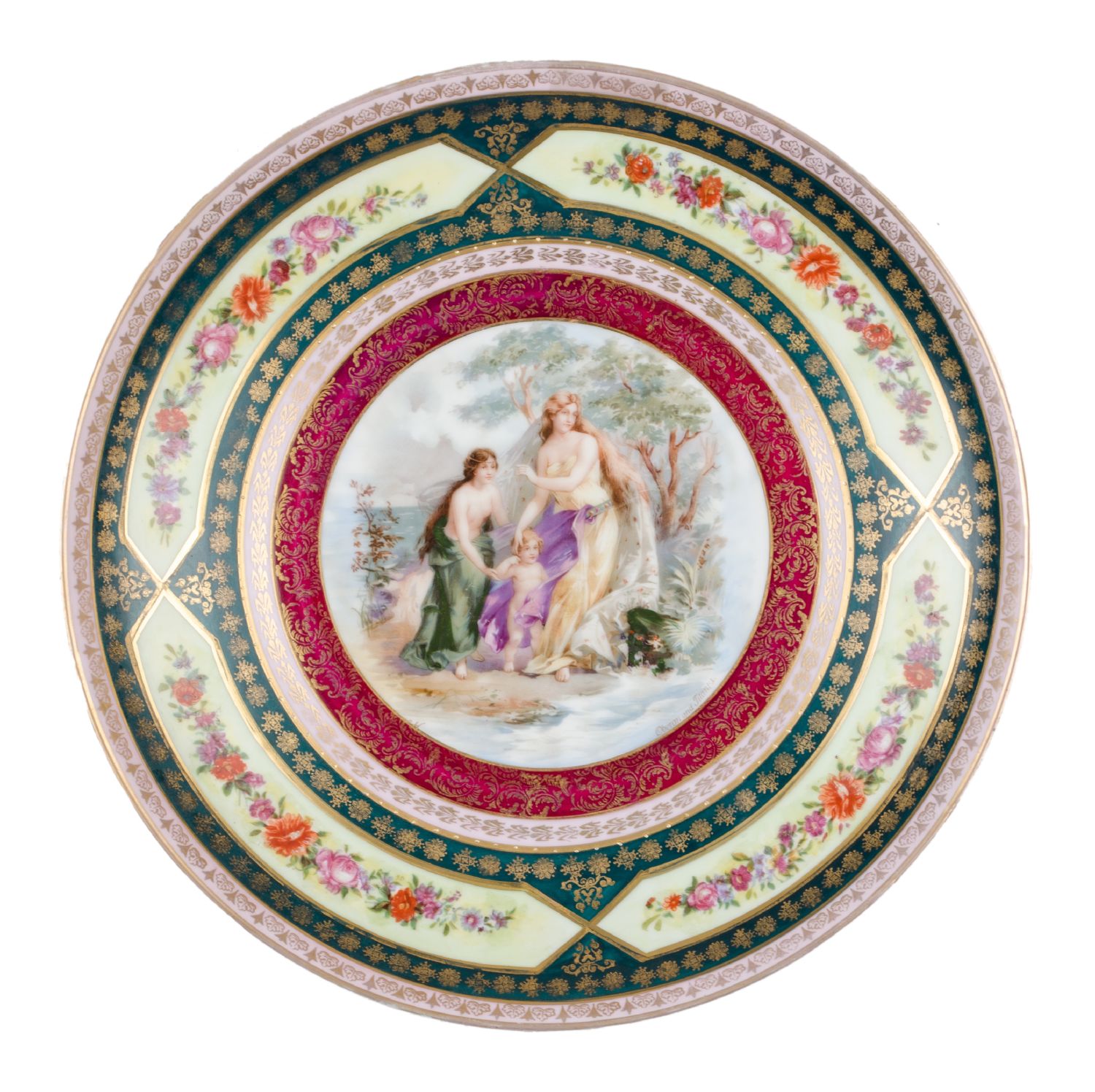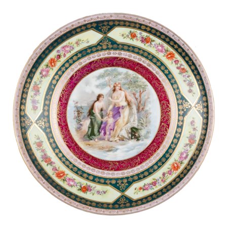 PIATTO in porcellana Vienna decorata con medaglione centrale raffigurante "scena mitologica". Austria primi '900 Misure: diametro cm 29