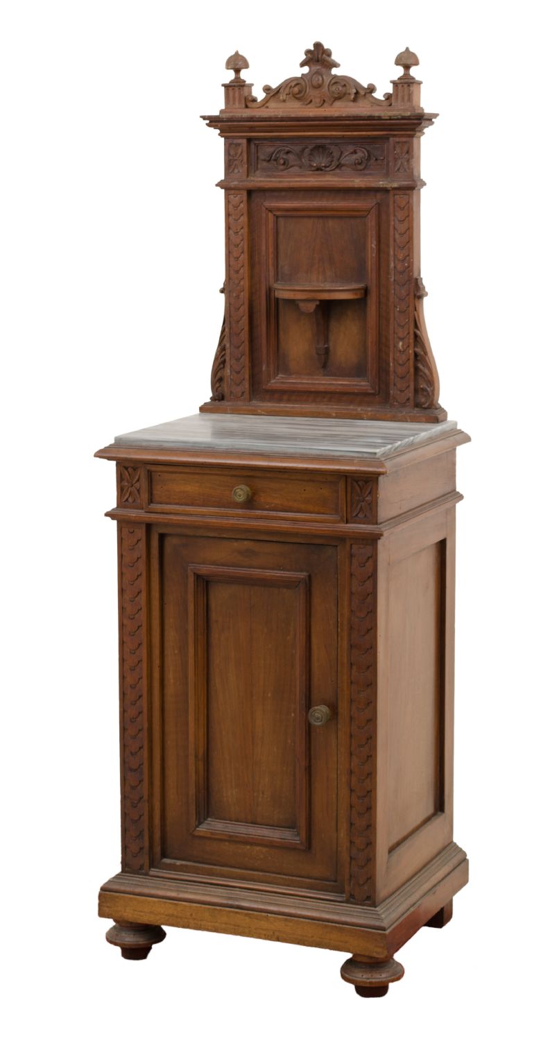 COMODINO in noce ad un'anta con alzatina e piano in marmo grigio incassato. Liguria fine '800 Misure: cm 38 x 47 x h 141