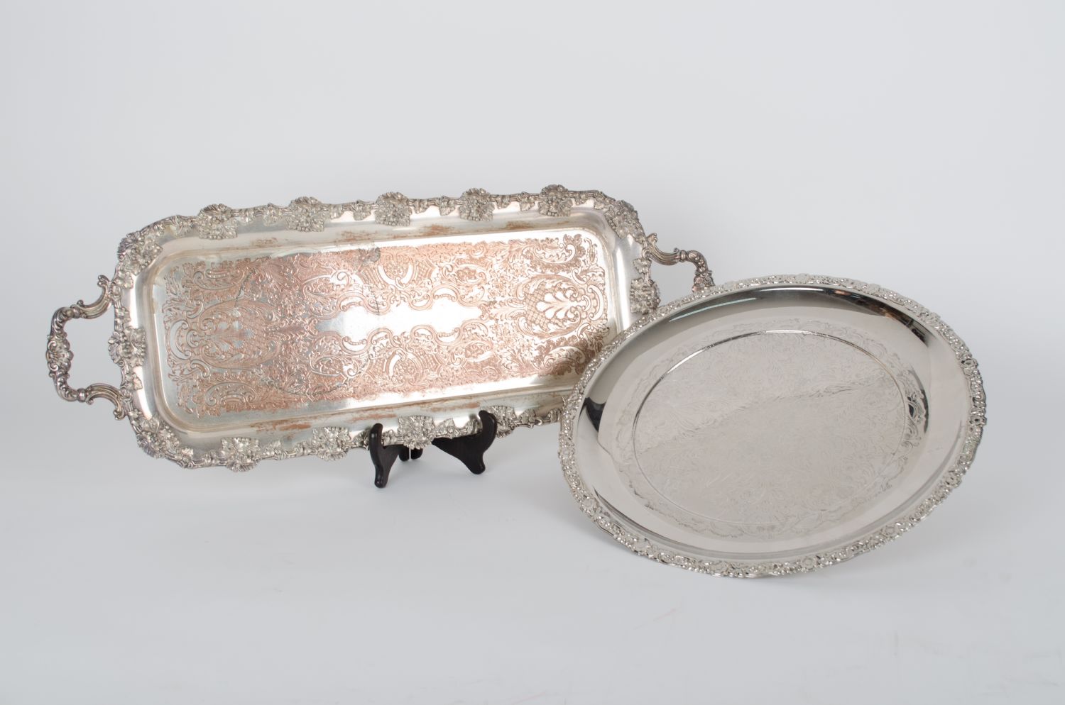 LOTTO composto da VASSOIO in metallo argentato con manici, bordo lavorato con tralci d'uva e foglie e da ALZATINA in metallo argentato. Inghilterra XX secolo Misure: varie