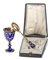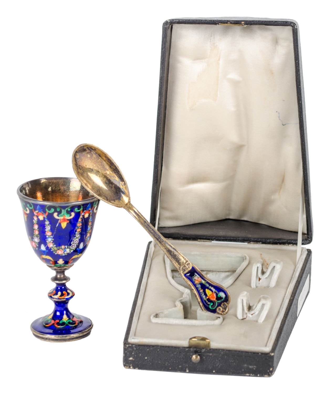PORTAUOVO con cucchiaino in argento, cloisonnet e porcellana blu decorata a...
