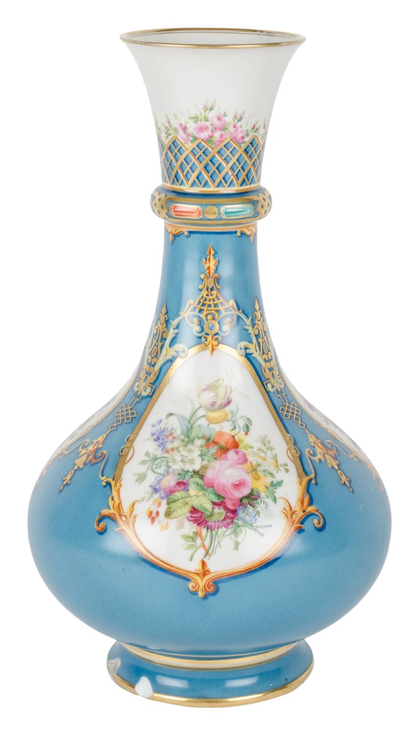 VASO in porcellana decorata nei toni del blu decorato a motivo floreale (rotture). XIX secolo Misure: h cm 40