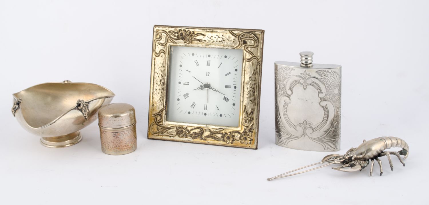 LOTTO composto da SVUOTASCHE, PORTAPILLOLE a forma di aragosta e da FIASCHETTA. XX secolo Misure: varie