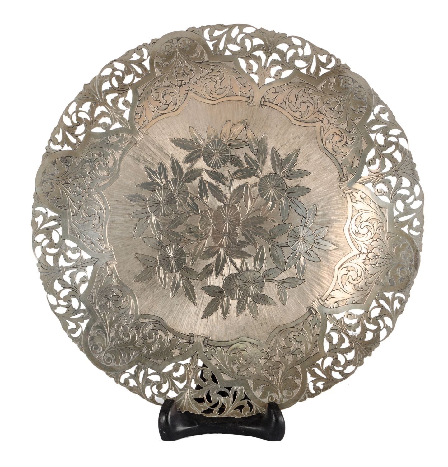 CENTROTAVOLA in argento inciso e traforato a motivo floreale. Sicilia periodo Liberty primi '900 Misure: diametro cm 27