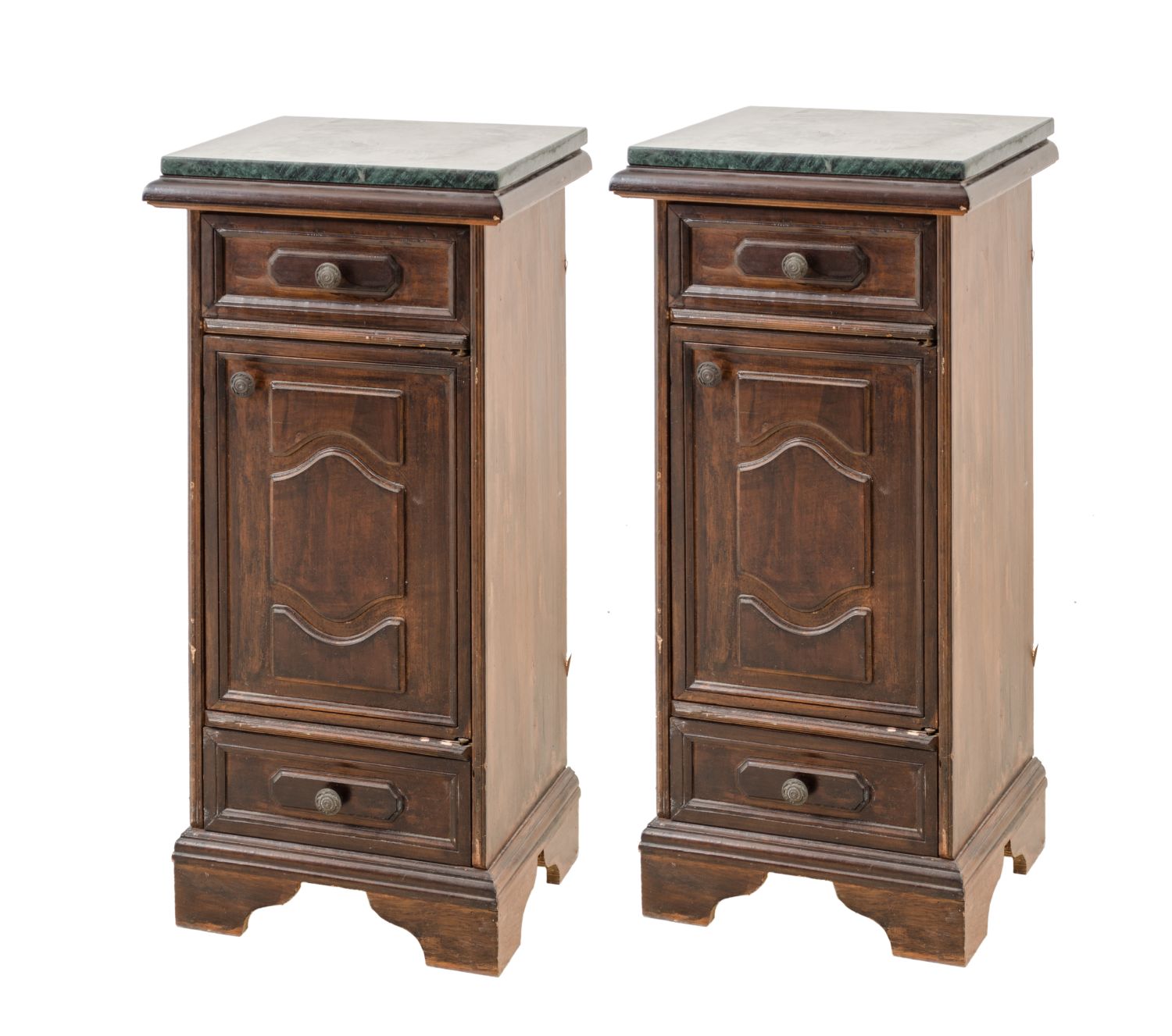 COPPIA COMODINI in mogano ad un'anta con cassetto sovrastante e cassetto sottostante. XX secolo Misure: cm 36 x 30,5 x h 77,5