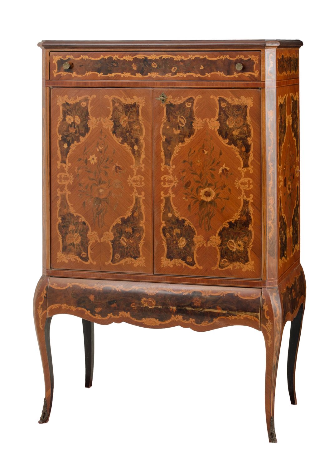 MOBILE bar stile Maggiolini in legno di rosa e radica di noce intarsiato a motivo floreale. Lombardia XX secolo Misure: cm 88 x 42 x h 132