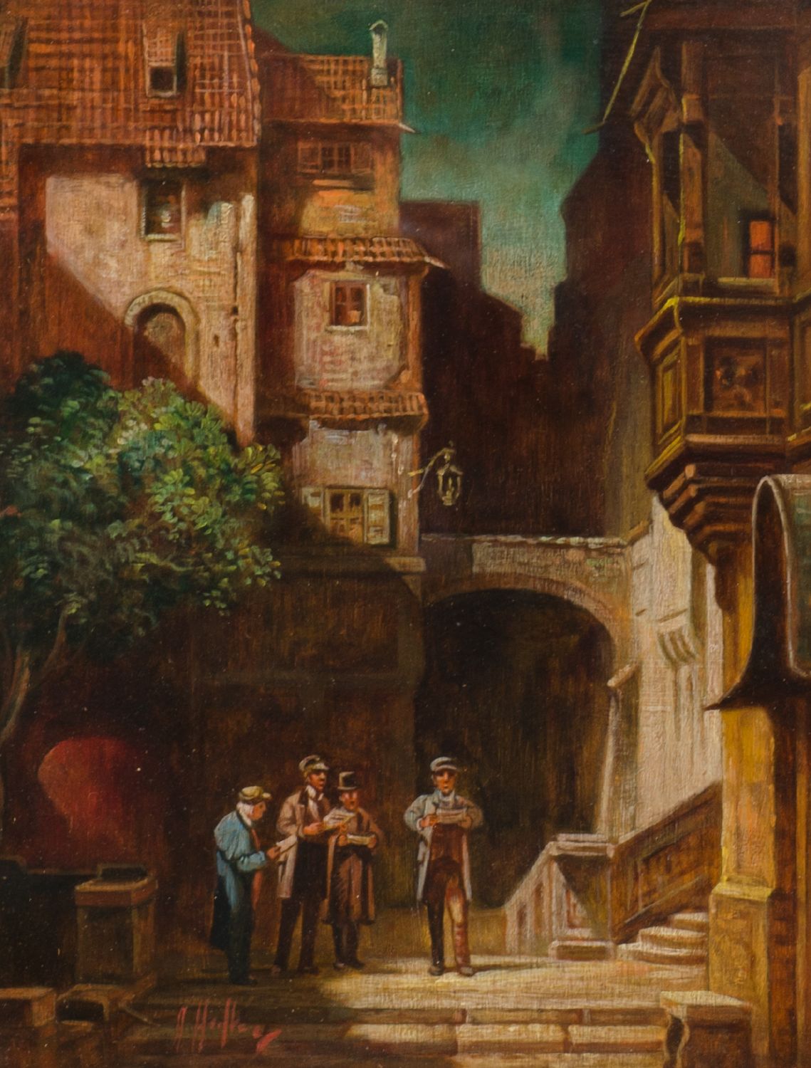OLIO su tavoletta "caseggiato con personaggi", firmato in basso a sinistra. XX secolo Misure: cm 31 x 25