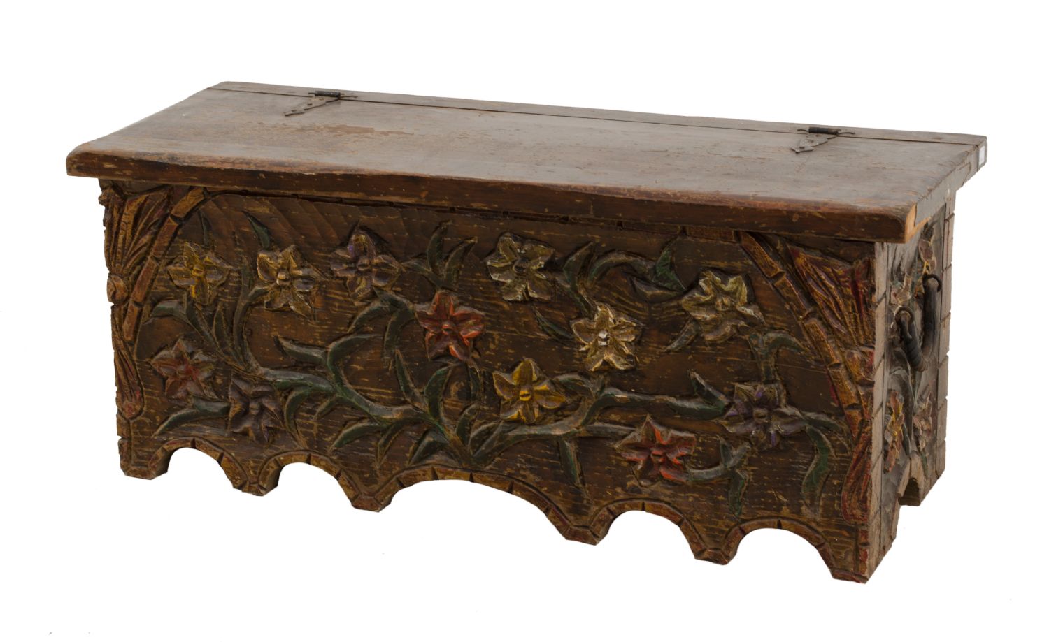 PICCOLA CASSA in legno dipinto riccamente intagliato a motivo floreale. Spagna XX secolo Misure: cm 35 x 92 x h 40