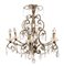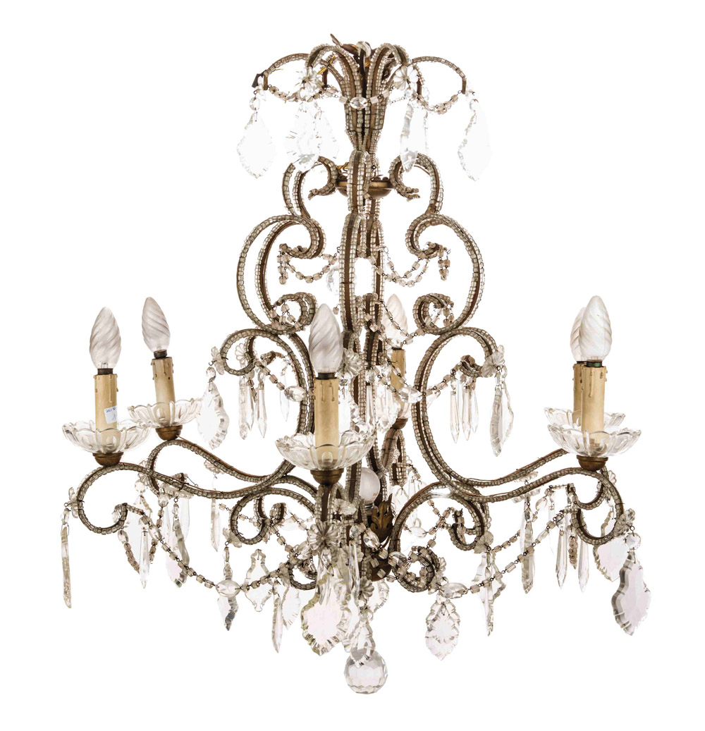 Lampadario a sei luci e coppia di Appliques a cinque luci in metallo e cristalli, fine XIX secolo. Difetti e mancanze. Appliques cm 55 x 52 x 30 Lampadario cm 65 x 70 Diametro cm 36, altezza cm 76