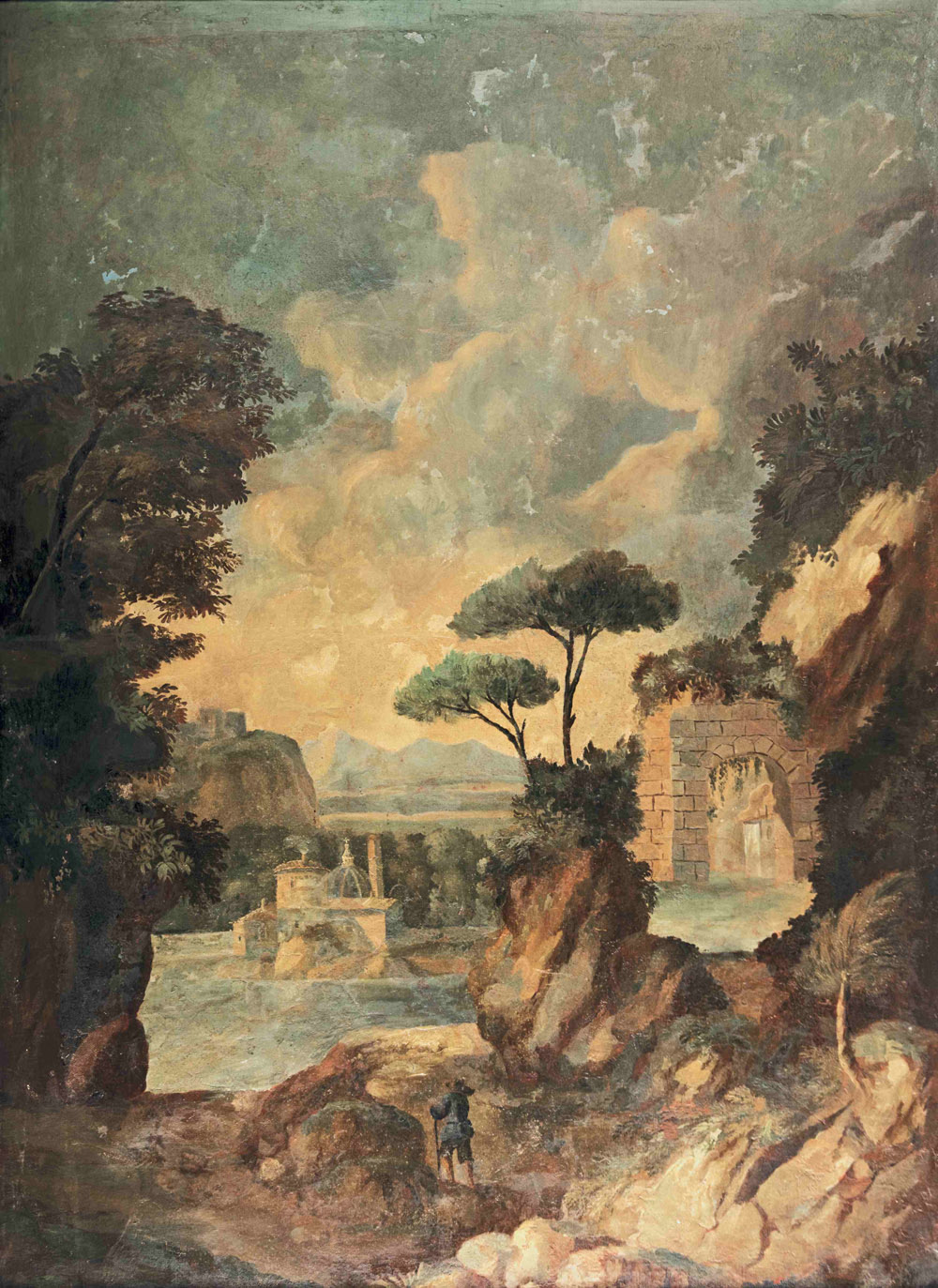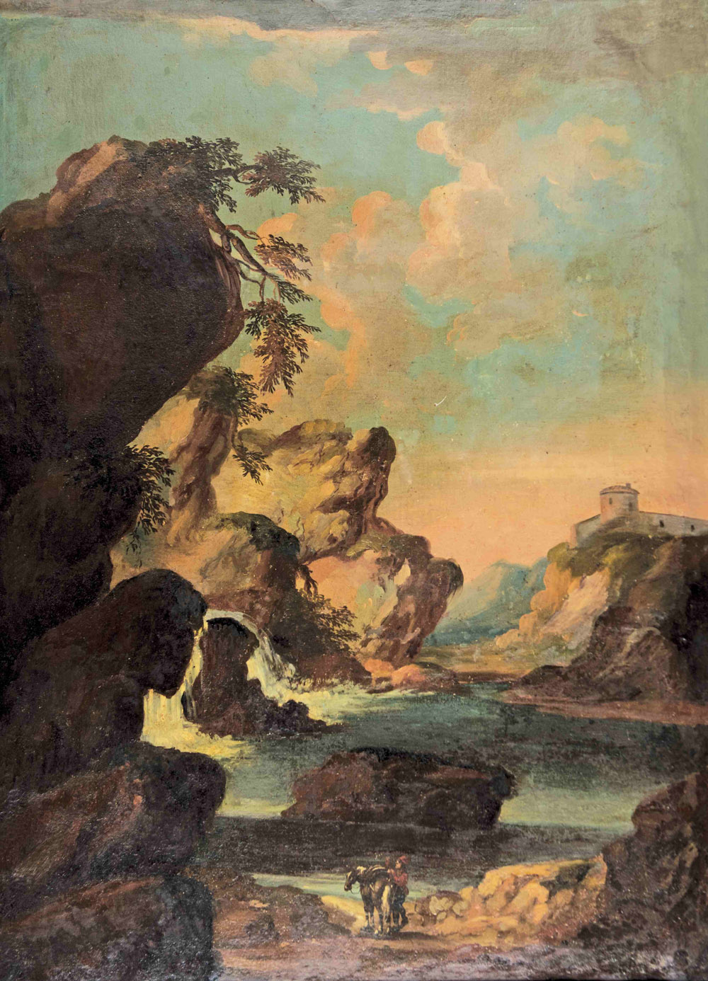 Anonimo del XVIII secolo Coppia di paesaggi con figure entro cornici coeve Diffusi restauri e ridipinture. Olio su tela. Misure cm 137 x 99