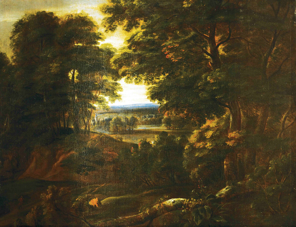 Anonimo del XVII secolo Paesaggio Seguace di Gaspard Dughet Olio su tela. Misure cm 79 x 100
