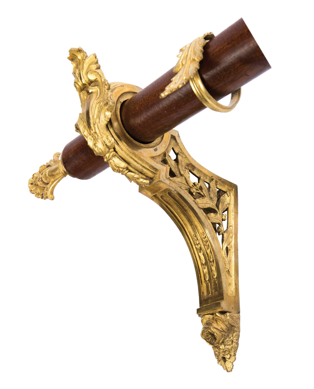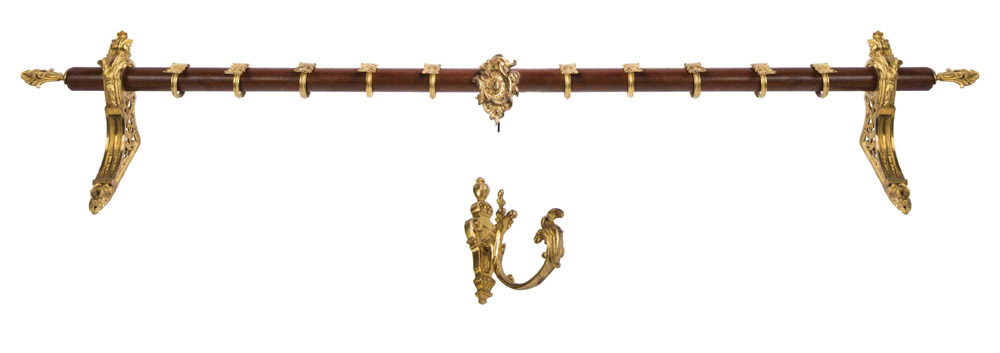 Mantovana e coppia di Porta Embrasse stile Luigi XVI in mogano e bronzo dorato, completa di stemma centrale ed anelli reggitenda Napoleone III, Francia XIX secolo. Misure cm 235