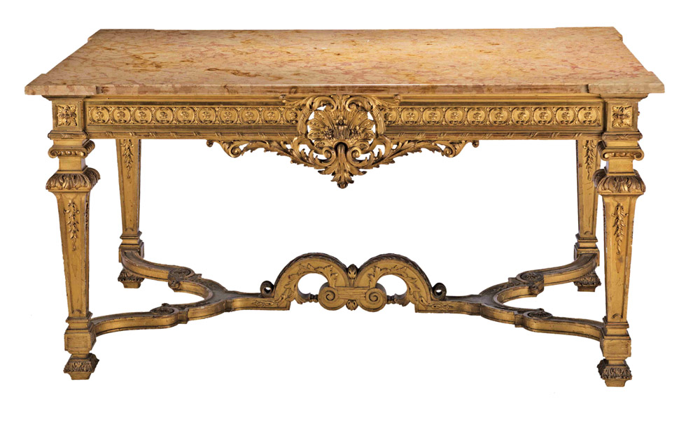 Importante tavolo da centro in legno finemente intagliato e dorato, FRANCIA XIX SECOLO Fascia sottopiano decorata e centrata da conchiglia stilizzata con applicazioni floreali, gambe troncoconiche, intagliate, riunite da traversa centinata, piano in marmo giallo non coevo. Difetti. Misure cm 146 x 65 x 89