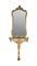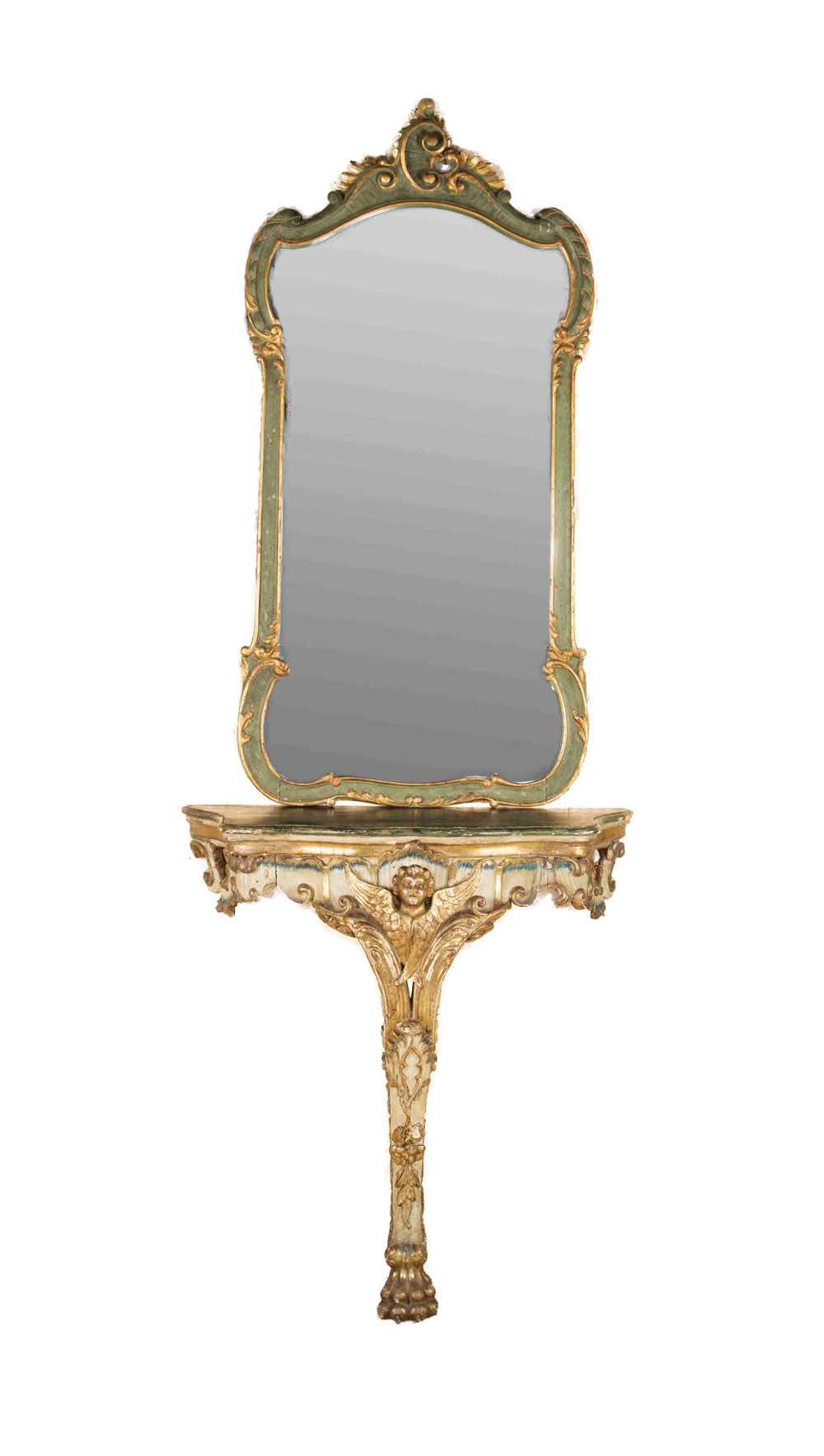 Console a mensola in legno intagliato e dorato a mecca, XVIII secolo Piano in legno decorato a finto marmo, fascia sagomata e gamba di linea mossa centrata da testa di cherubino alato e terminante con piede ferino. Specchiera cm 140 x 70. Misure cm 98 x 90 x 45