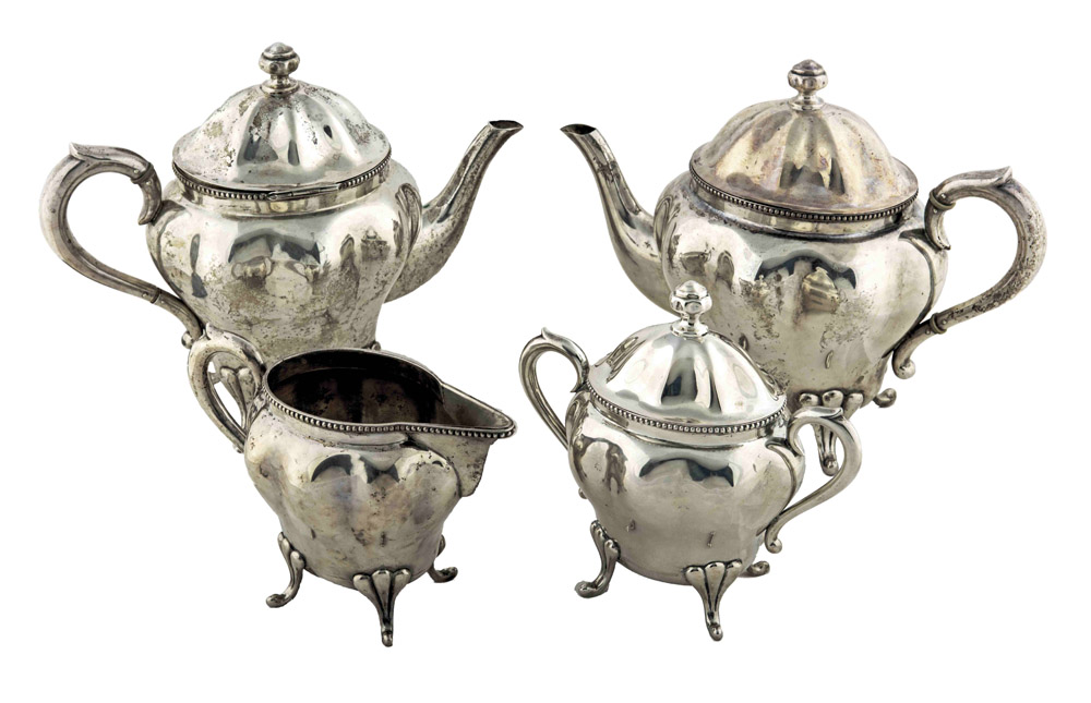 Servizio da tè in argento composto da lattiera, teiera, zuccheriera e caffettiera. Grammi 1831 ca.