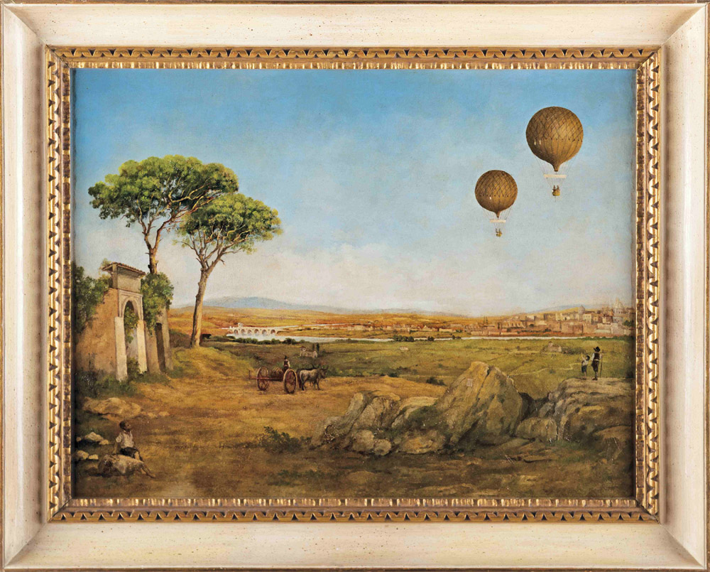 Anonimo del XIX secolo Palloni aerostatici sopra Roma, 1884 Olio su tela. Misure cm 45 x 59