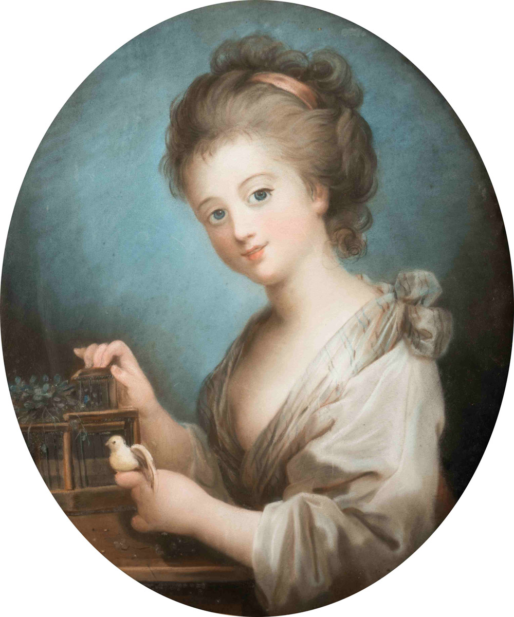 Scuola francese del XVIII secolo Coppia di dipinti: Fanciulla con maschera, fanciulla con cardellino Coppia di pastelli su carta. Misure cm 65 x 53