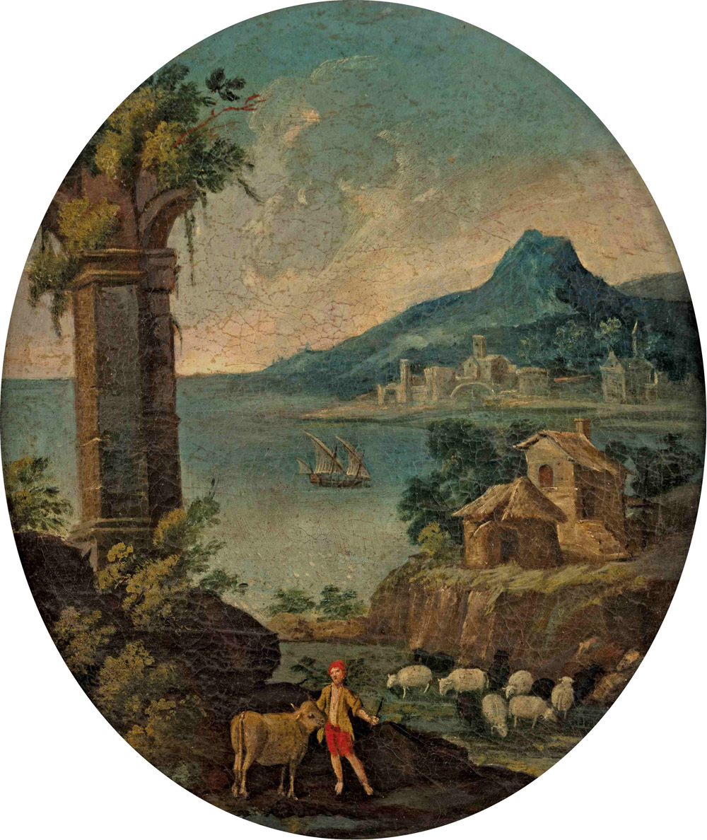 Lotto 70 | Scuola Italiana del XVIII secolo Paesaggi lacustri con personaggi Coppia di...