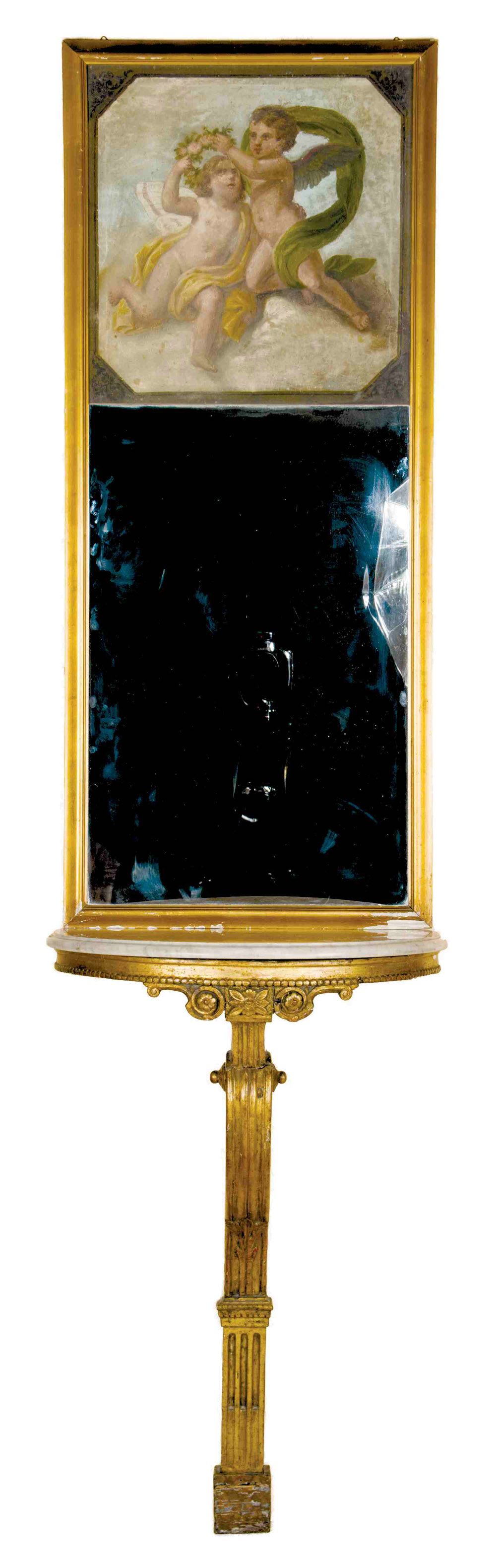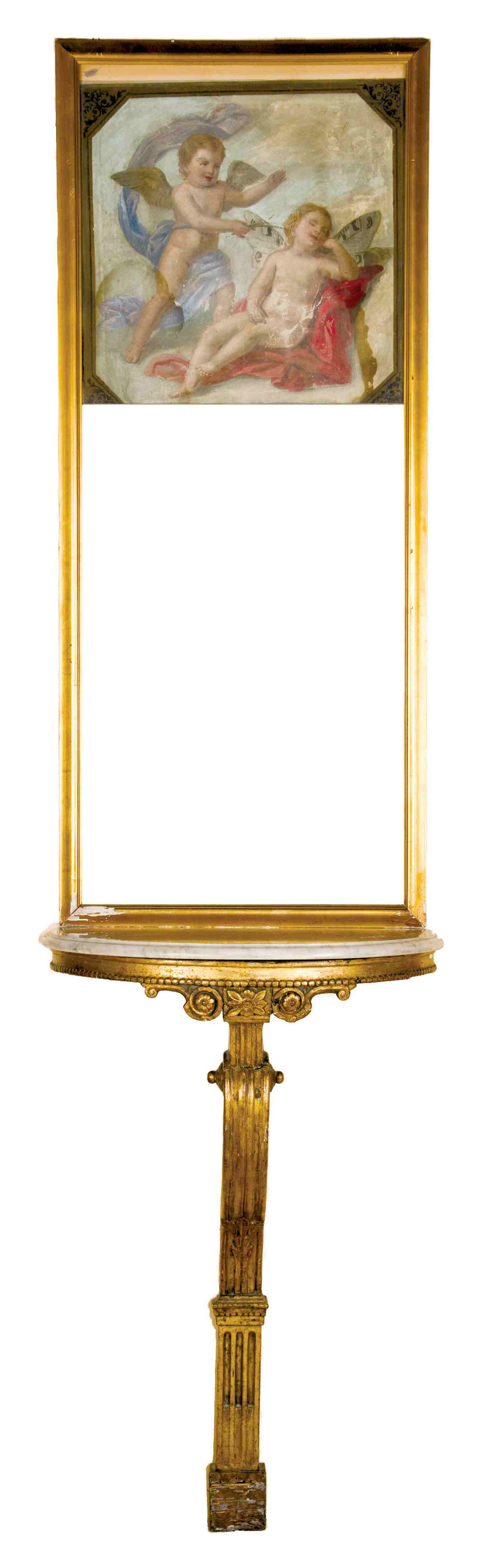 Coppia di consoles a demilune in legno intagliato e dorato a mecca Italia Inizi del XIX secolo Sorrette da un sostegno centrale centinato e scanalato su base a plinto, piani in marmo bianco; specchiere di accompagno rettangolari sormontate da dipinti a tempera raffiguranti giochi di Putti. Consoles cm 90 x 56 x 35, Specchiere cm 133 x 56