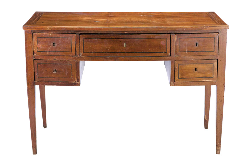 Scrivania stile luigi XVI in legno di noce, Italia inizi del XIX secolo Filettature sul piano e sui cinque cassetti. Restauri e difetti. Misure cm 80 x 117 x 55