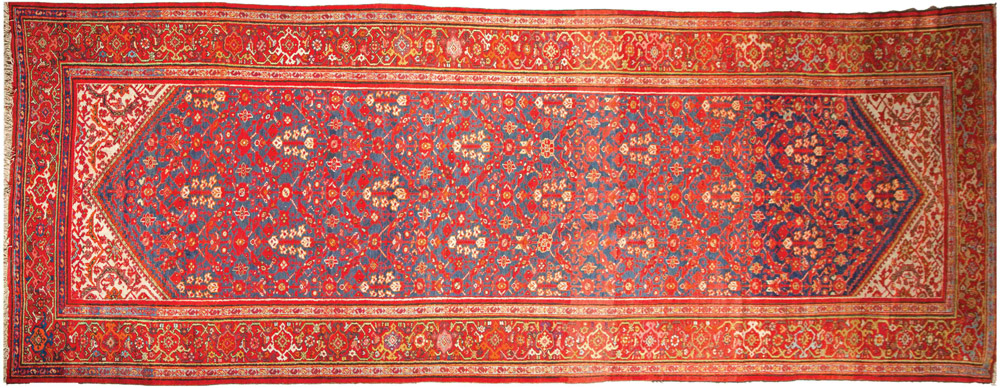 Tappeto Persiamo Malayer Fondo rosso decorato nei toni del blu e del bianco. Difetti. Misure cm 505 x 205