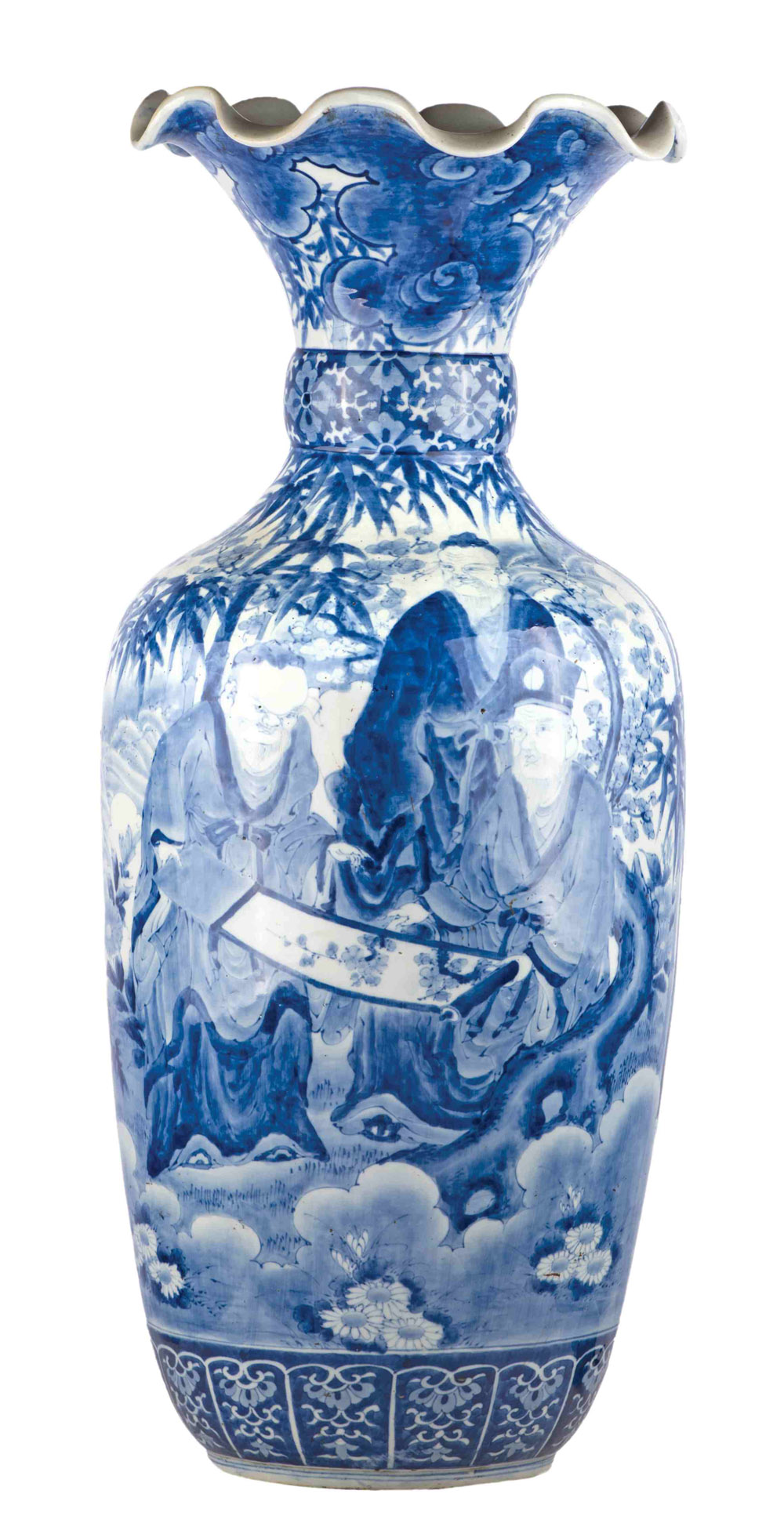 Coppia DI Vasi, Cina XIX secolo IN PORCELLANA BIANCA E BLU Bordi svasati e sagomati, decorati con una raffinata scena paesaggistica animata da dignitari. Altezza cm 78