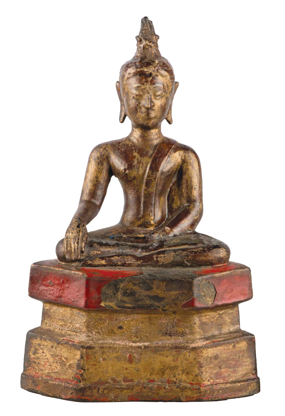 Figura di Buddha in bronzo dorato, Sino-Tibet Tracce di policromia. Altezza...