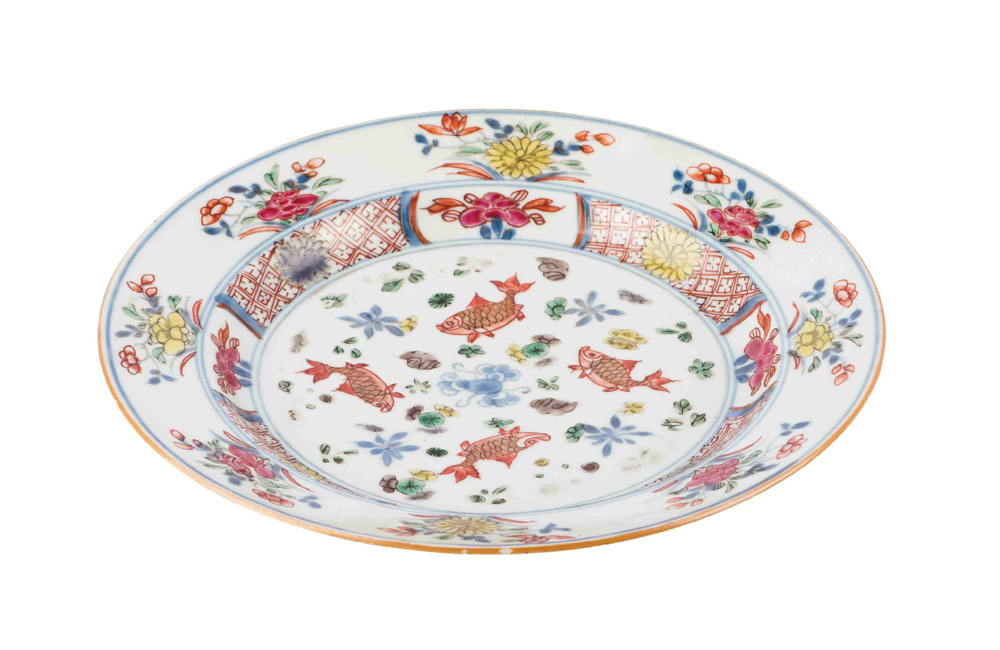 Piatto in porcellana Cina Decoro policromo con pesci al centro e motivi vegetali e floreali sulla tesa. Diametro cm 22,5
