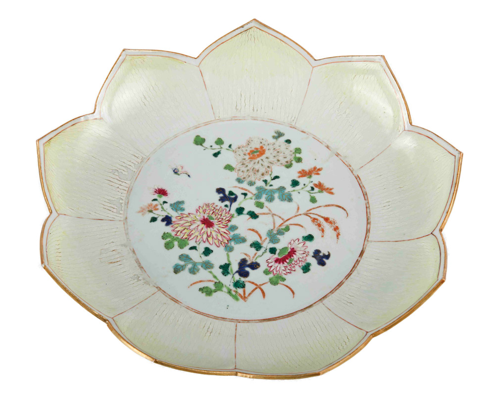 Piatto in porcellana, Famiglia Rosa, Cina XIX secolo a forma di petalo con...