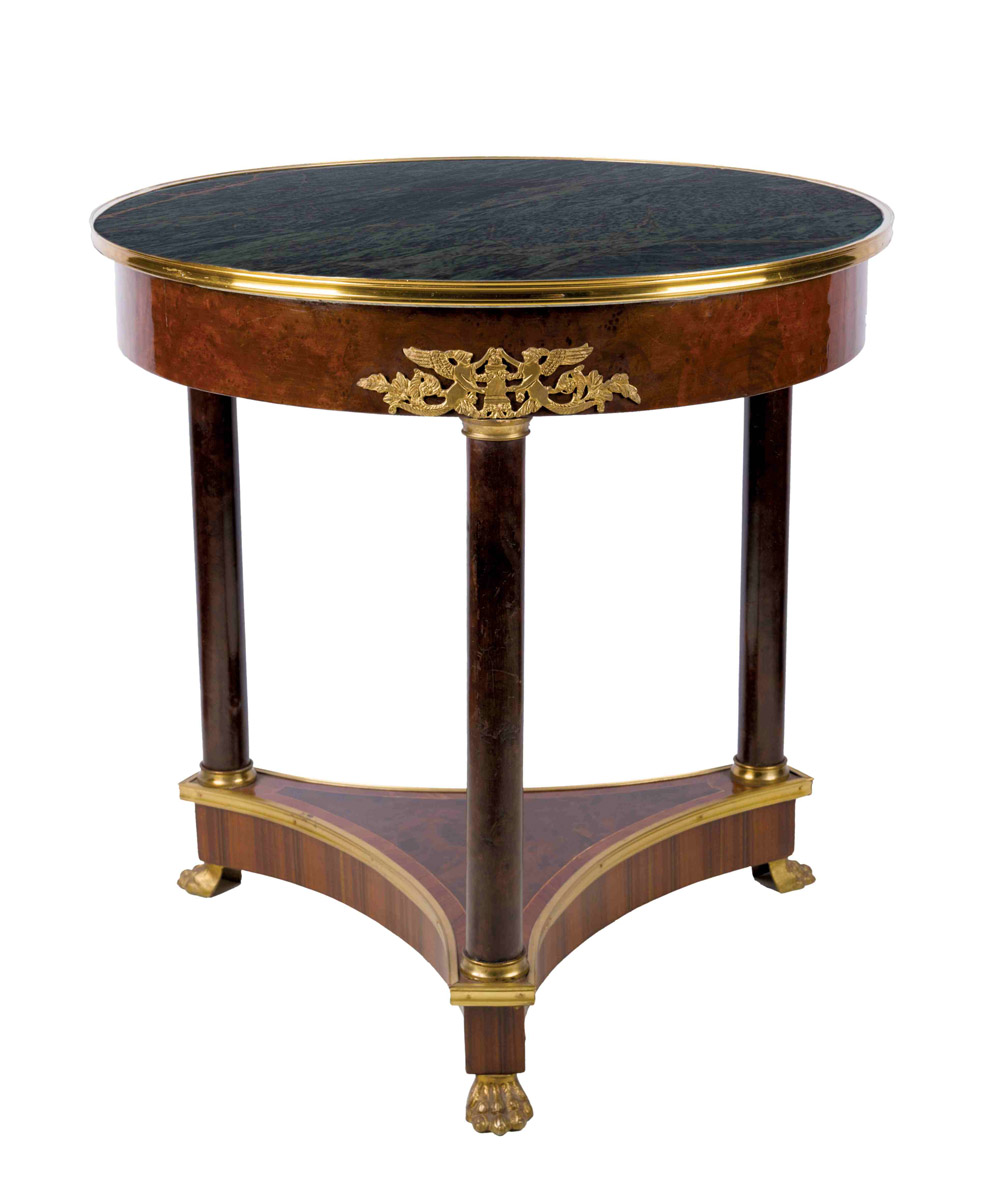 Coppia di tavoli in stile impero, Francia fine del XIX secolo Piani in marmo verde profili ed applicazioni in bronzo dorato, sostegni a colonna e piedi ferini. Misure cm 78 x 76