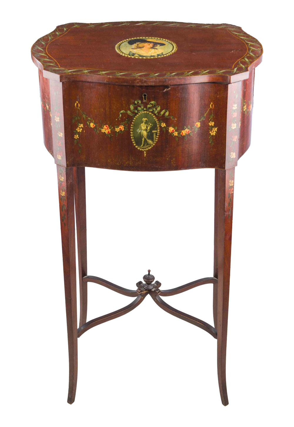 Tavolinetto da lavoro in legno laccato e dipinto, Inghilterra inizi del XX secolo Piano sagomato apribile, centrato da ritratto di gentildonna ed ornato da ghirlande di fiori dipinte, intervallate da medaglioni di gusto neoclassico. Misure cm75 x 42 x 34