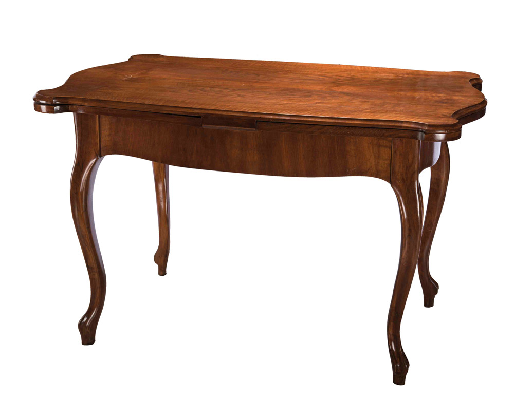 Tavolo allungabile in noce fine del XIX secolo Gambe mosse ed alette estraibili nel sottopiano. Misure cm 82 x 126 x 87