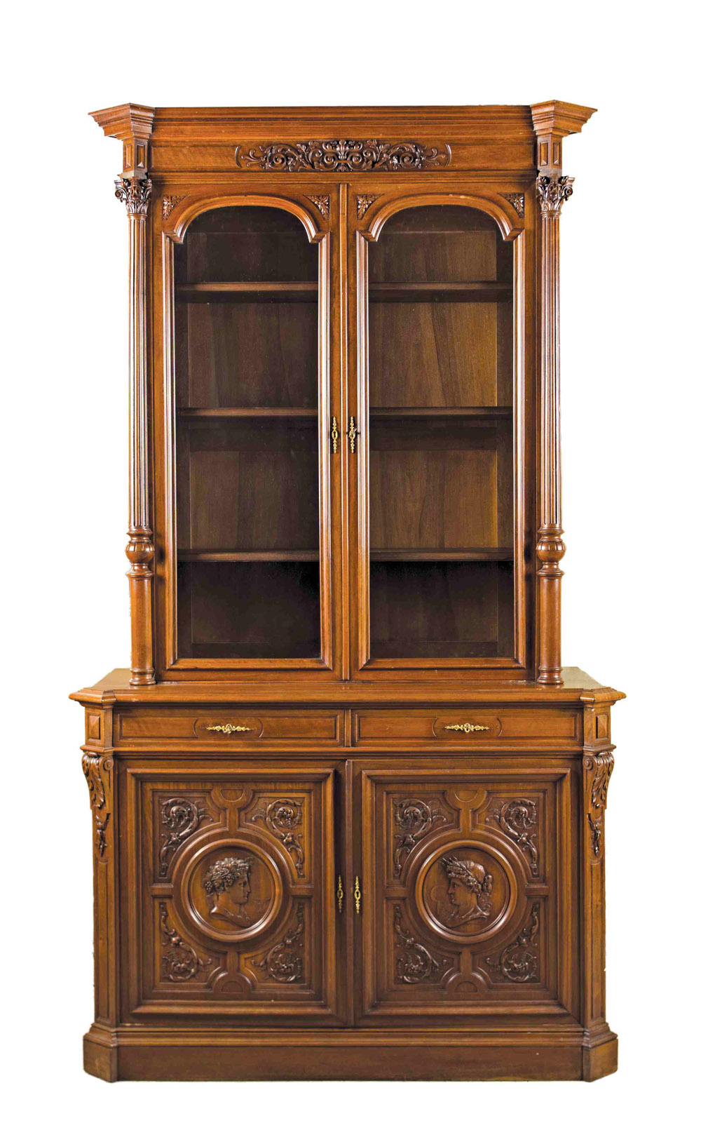 Credenza a doppio corpo fine XIX secolo in legno di noce caratterizzata da ricchi intagli di gusto neoclassico. Misure cm 236 x 137 x 56