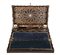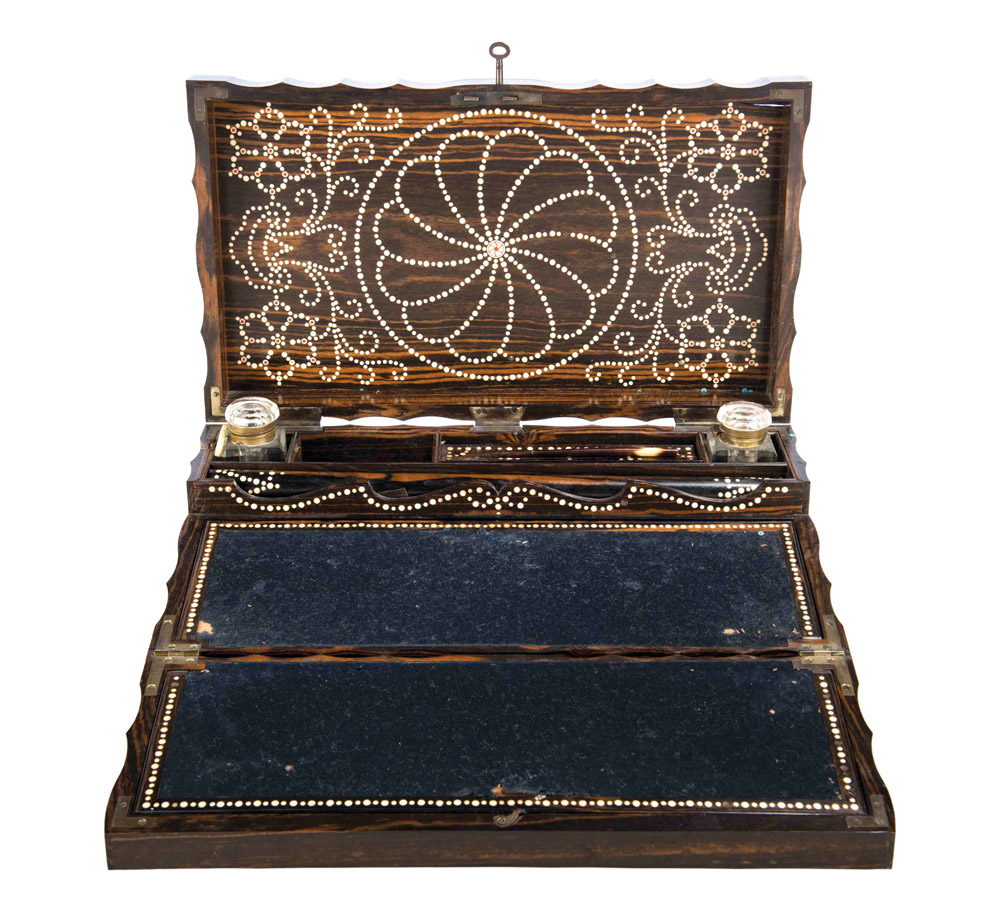 Scrittoio da tavolo in legno coromandel, Inghilterra XIX secolo Bordi frastagliati, coperchio ribaltabile con piano scrittoio al verso in panno blu. Internamente intarsiato in avorio a volute e motivi floreali stilizzati, scomparti e cassetti segreti. Completo di calamai e accessori per la scrittura. Misure cm 13,5 x 41 x 23,5
