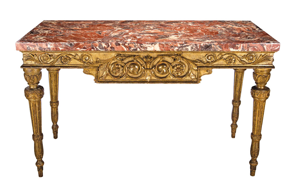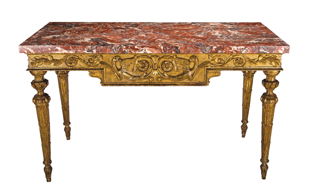 Due ConsoleS in legno intagliato e dorato a mecca, Italia centrale ultimo quarto del XVIII secolo Una con fascia decorata a motivo vegetale, altra con fascia decorata a motivo vegetale centrata da draghi stilizzati,, gambe troncoconiche scanalate, piano listrato in marmo fior di pesco. Difetti.