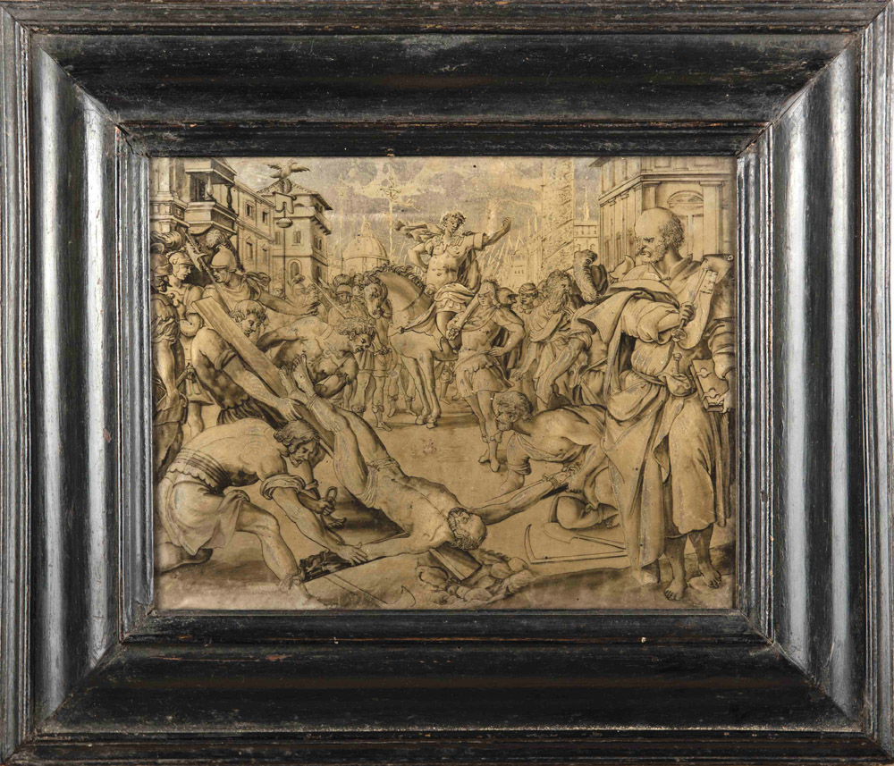 Scuola Nord Europea del XVII secolo Martirio di San Pietro Incisione sottovetro. Misure cm 19 x 25