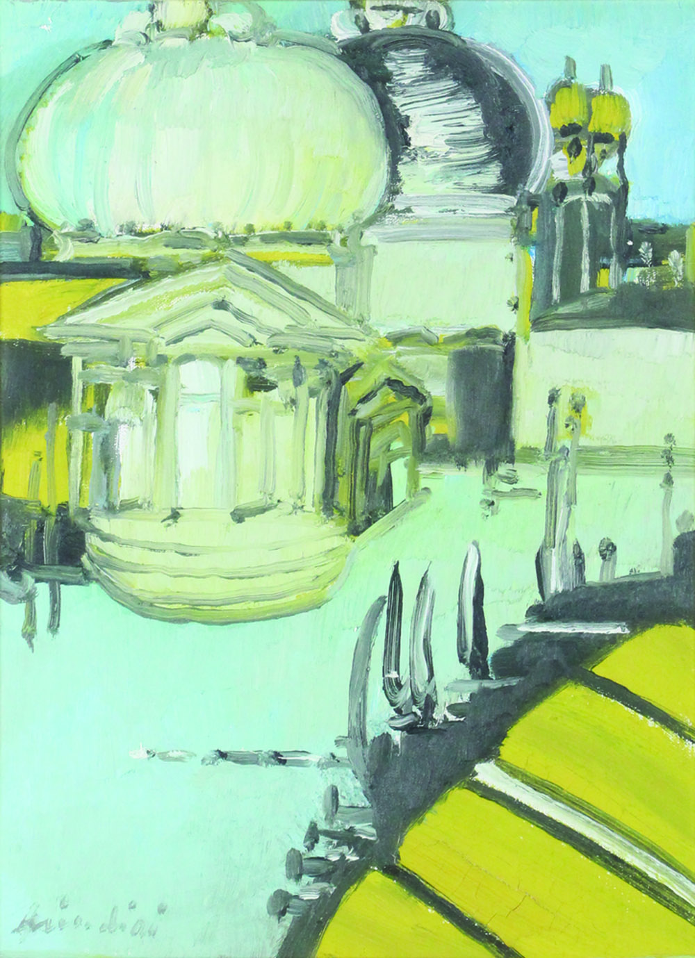 Remo Brindisi, Venezia, 1983, olio su tela, cm. 40x30, firmato in basso a sinistra, firmato, intitolato e datato al retro, timbro per autenticità della Galleria Bonaparte di Milano al retro, opera archiviata dall'Archivio Remo Brindisi presso la Galleria Bonaparte di Milano con n. 674 e dalla Galleria Pace di Milano al n. 2611, il tutto certificato da fotografia autenticata da entrambi gli archivi con rispettivi timbri e timbri a secco, opera pubblicata sul Secondo Volume del Catalogo Generale