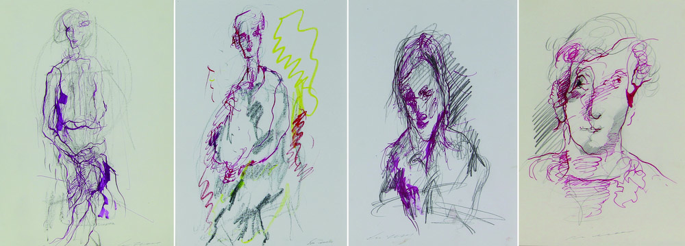 Ernesto Treccani, Figure, lotto di 4 tecniche miste su carta, cm. 30x21 ciascuna, firmate in basso, senza cornici