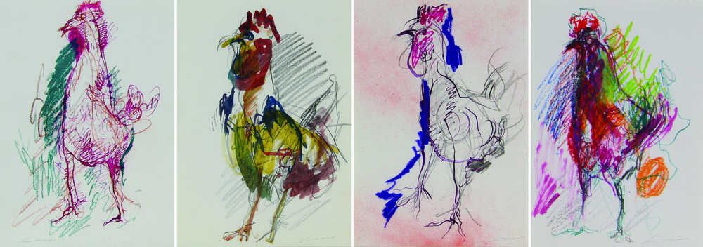 Ernesto Treccani, Galli, lotto di 4 tecniche miste su carta, cm. 30x21...