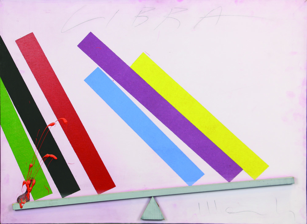 Aldo Mondino, Libra, (primi anni '70), olio e applicazioni di legni su tela, cm. 60x80, firmato in basso a destra e al retro, intitolato in alto al centro, dicitura di pugno dell'artista "Per Giraldi" e firma "Giraldi" con numero 42 al retro