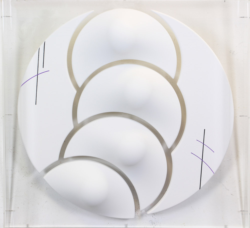 Andrea Bassani, Senza titolo, acrilico su tele sagomate entro teca di plexiglass, diam. cm. 54, firmato al retro e a lato