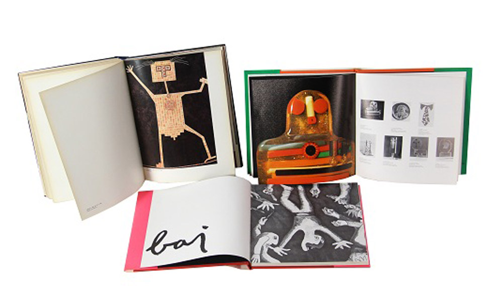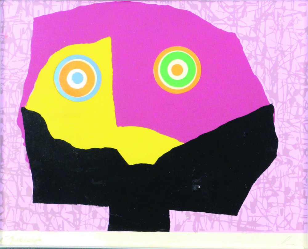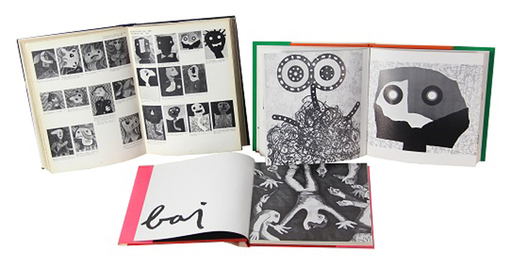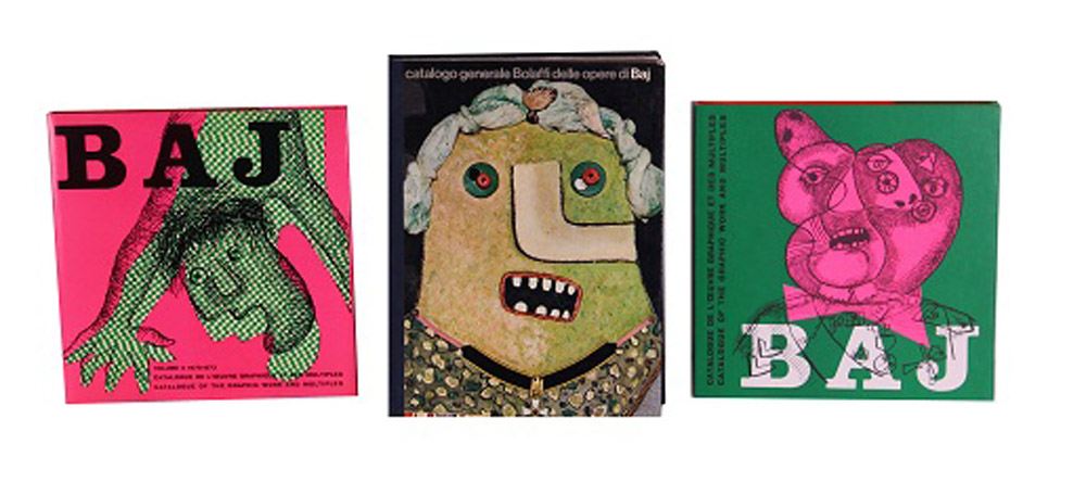 Enrico Baj, lotto di 3 cataloghi ed un'opera: 1. Consuelo, 1967, tecnica mista e collage su cartone applicato su tela, cm. 22x28, firmata in basso a destra, opera pubblicata sul "Catalogo Generale Bolaffi delle Opere di Baj", a cura di Enrico Crispolti, Torino, 1973, pag. 193, n. 1370 - 2. "Catalogo Generale Bolaffi delle Opere di Baj", a cura di Enrico Crispolti, Torino, 1973 - 3. "Catalogue de l'Oeuvre Graphique et des Multiples", Volume Primo, opere 1952/1970, Rousseau Editeur, Geneve - 4. "Catalogue de l'Oeuvre Graphique et des Multiples", Volume Due, opere 1970/1973, Rousseau Editeur, Geneve