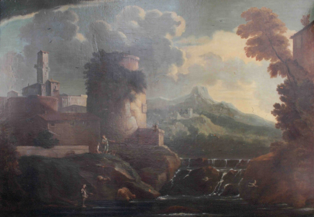 Ambito di Jan Frans van Bloemen, Paesaggio con borgo e tempietto, fine XVII inizio XVIII secolo Olio su tela, 115 x 156 cm. Il paesaggio mostra sulla sinistra un borgo e un tempietto classico, sotto cui sono raffigurati alcuni pastori e un uomo che pesca in un ruscello, mentre sulla destra, in asse con una cascatella e oltre uno sperone roccioso su cui si erge un edificio appena accennato, si apre una prospettiva che digrada in lontananaza verso una città turrita e dei monti. Opera di grande qualità, caratterizzata da raffinati effetti cromatici e luministici, al pari del Paesaggio con la basilica di San Pietro (cfr. lotto n. 16) essa richiama stilisticamente il nome del fiammingo Jan Frans van Bloemen detto l’Orizzonte (Anversa 1662 - Roma 1749), epigono di Gaspard Dughet e considerato tra i maggiori paesaggisti della sua epoca.