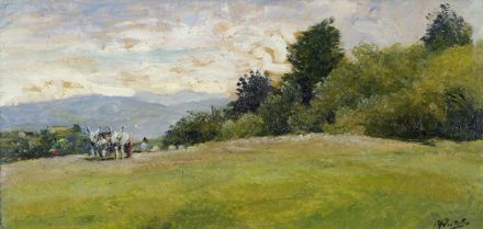 Rutilio Muti (Vicchio di Mugello, 1904 - 1995) IL PRATO, 1971 Olio su compensato, cm. 24x51 Firma in basso a destra. Sul verso: firma, data e titolo.