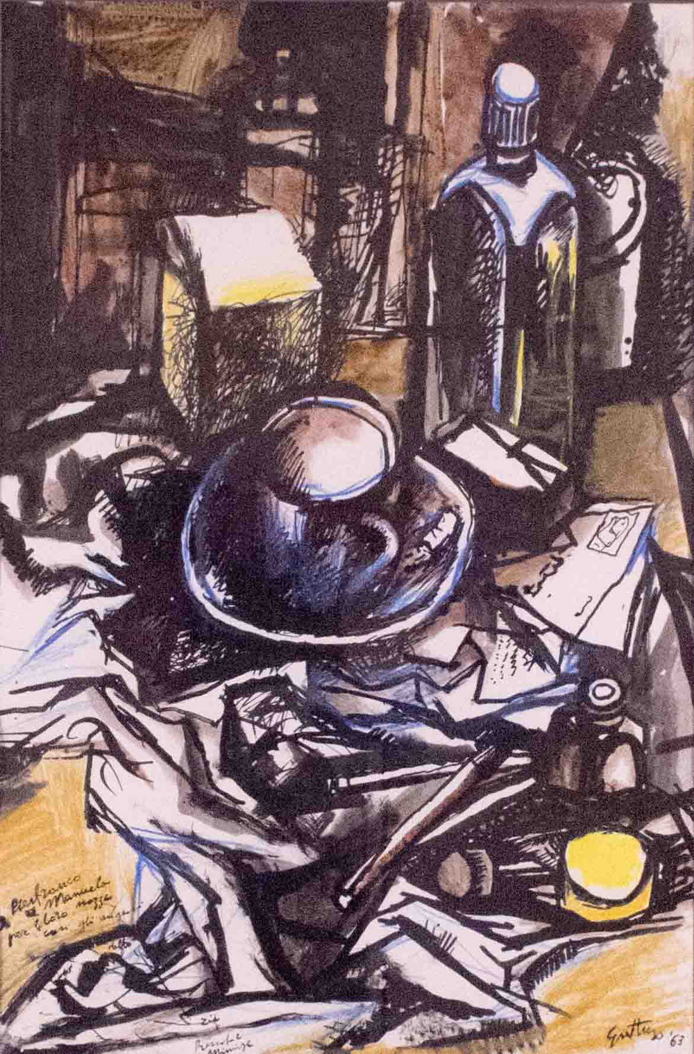 Renato Guttuso (Bagheria 1911 - Roma 1987), Natura morta, 1963 Tempera su carta, 42 x 28 cm. Dedica dell'autore "A Pierfrancesco e Manuela per le loro nozze con gli auguri della zia Renato e Mimise". Provenienza: Famiglia di Mimise Dotti Guttuso.