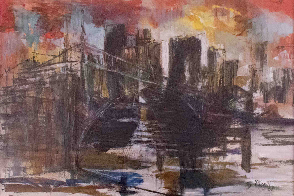 Giulio Picelli (Padova 1934), Il ponte, 1968 Tecnica mista su carta su tavola, 39 x 59 cm. Firmato "G. Picelli '68" in basso a destra