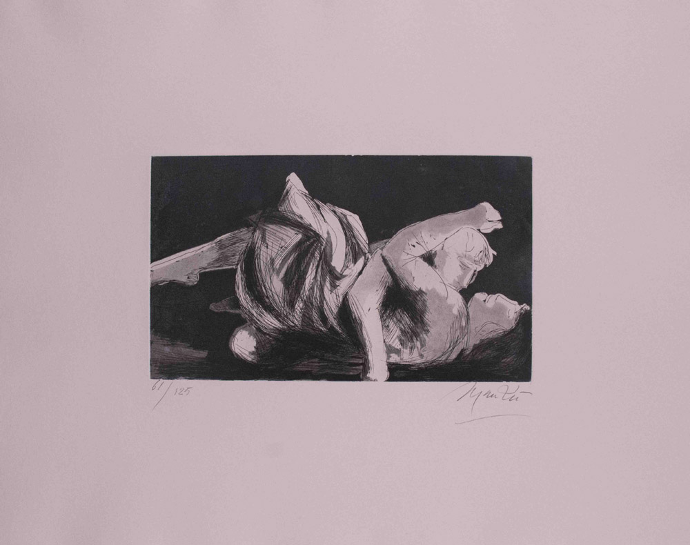 Giacomo Manzù (Bergamo 1908 - Roma 1991), Nudi di donna, Artista nudo al cavalletto, Abbraccio disteso 3 acqueforti e acquetinte su carta con firma dell'Artista in filigrana, esemplari 61/125, 50 x 65 cm