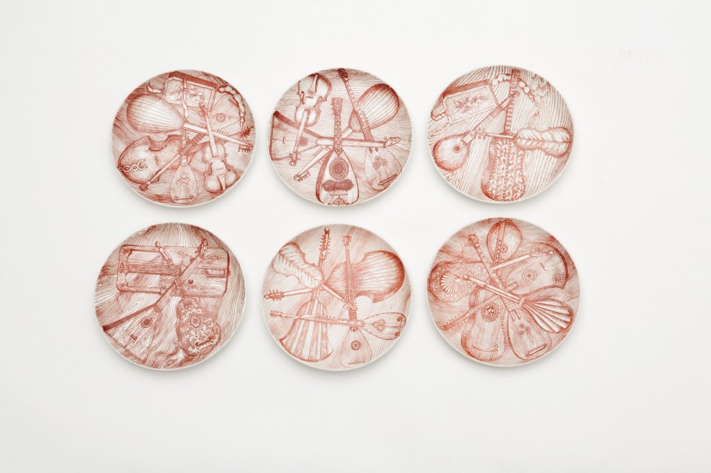Sei piatti "Strumenti musicali", anni '60.