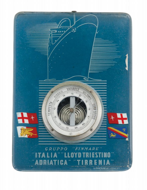 Un barometro e un termometro da parete pubblicitari per "ITALIA NAVIGAZIONE", anni '30.